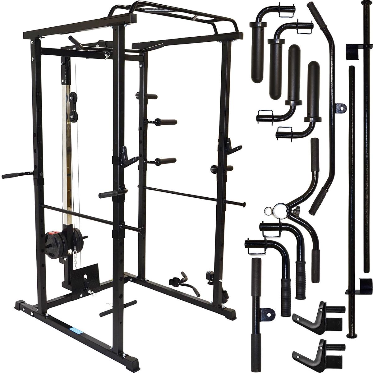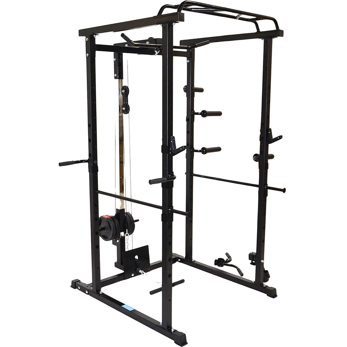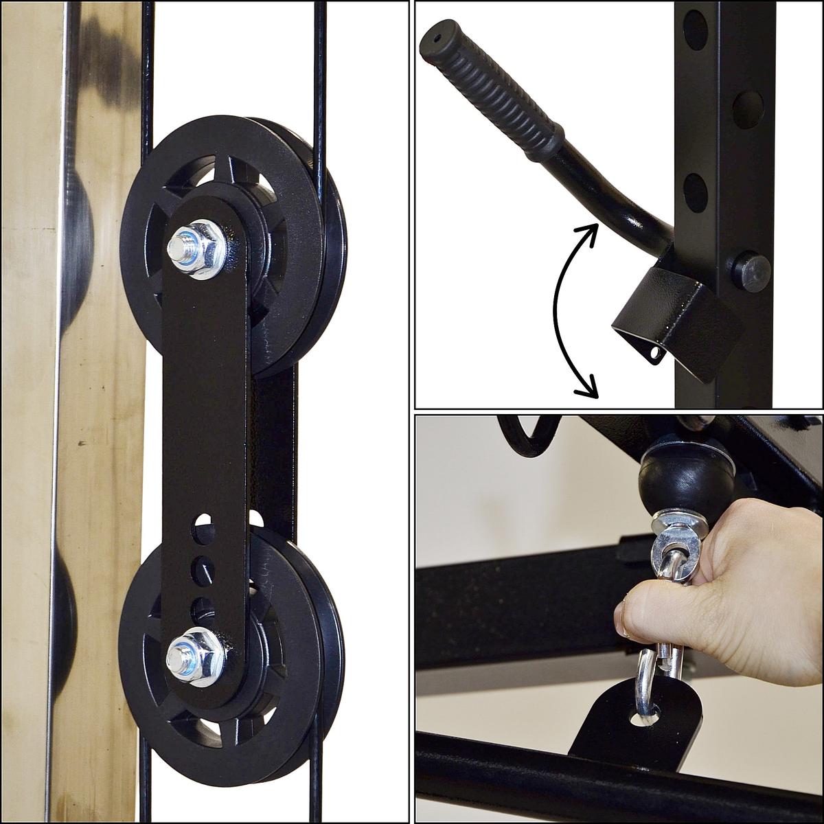 Brama zawiera drążek, wyciągi, uchwyty do pompek, stojaki na sztangę i uchwyty na talerze. Pozwala ćwiczyć plecy, klatkę, ramiona, nogi i brzuch w jednym miejscu. To rozwiązanie, które zastępuje kilka osobnych maszyn.