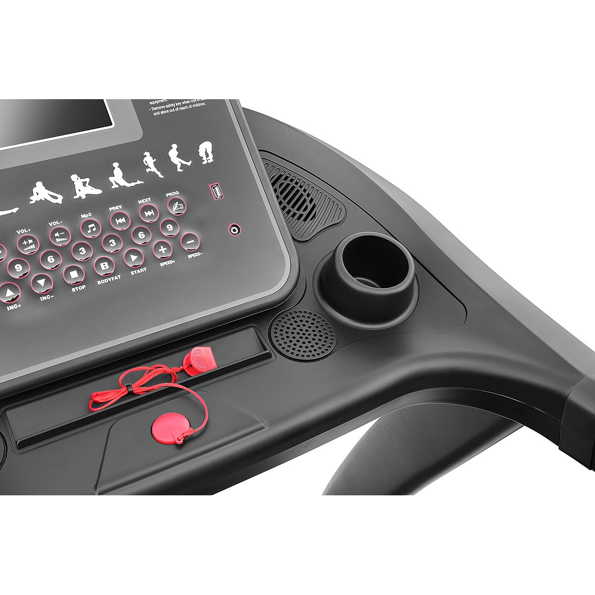 - antypoślizgowy pas biegowy i klucz bezpieczeństwa zadba o bezpieczeństwo ćwiczącego podczas biegu, marszu czy szybkim chodzie