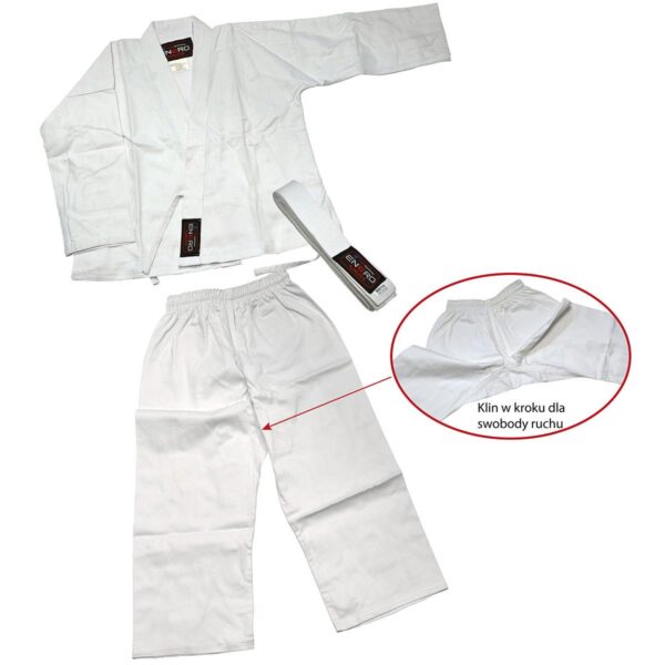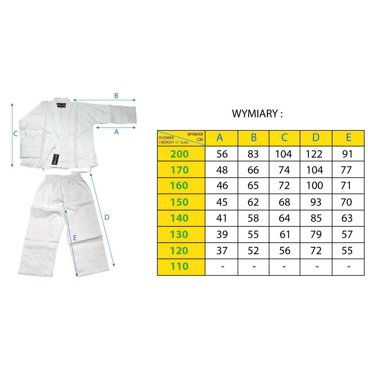 Klasyczne białe kimono karate wyróżnia się trwałością i odpornością na uszkodzenia. Strój uszyto w 100% z bawełny w oparciu o tradycyjny, uniwersalny fason. Bluza ma wzmocniony kołnierzyk, spodnie posiadają wszytą gumkę oraz sznurek do wiązania, dzieki temu zyskujesz wygodę i idealne dopasowanie. W zestawie otzrymasz także biały pas.
