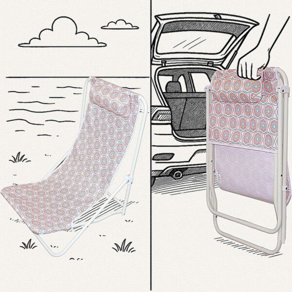 LEŻAK SKŁADANY PLAŻOWY Z ZAGŁÓWKIEM NIEBIESKO POMARAŃCZOWY to Twoja przepustka do błogiego odpoczynku – na plaży, w ogrodzie i gdziekolwiek chcesz złapać słońce. Rozkładasz, siadasz i… już jest dobrze!