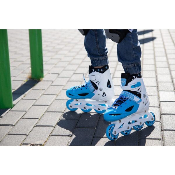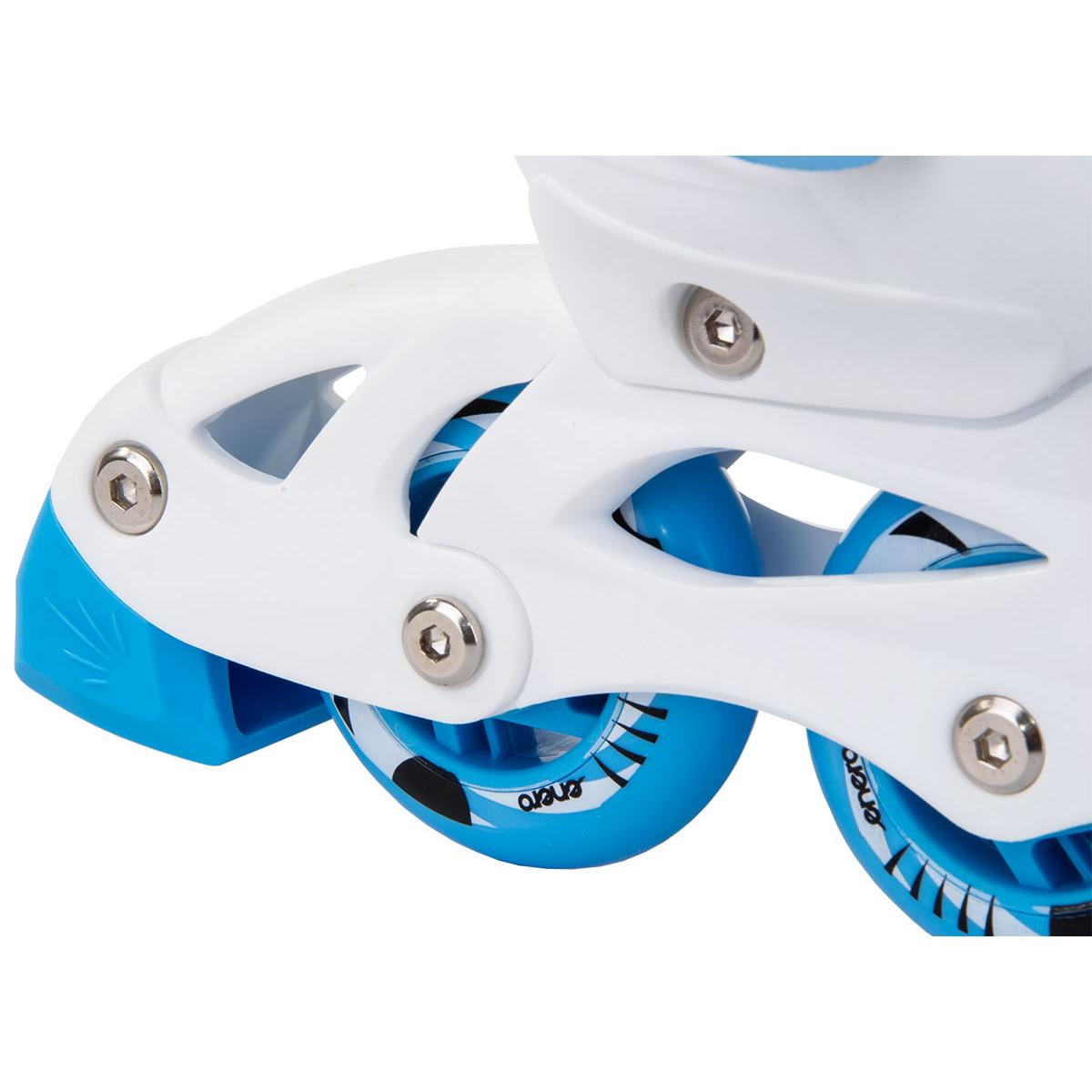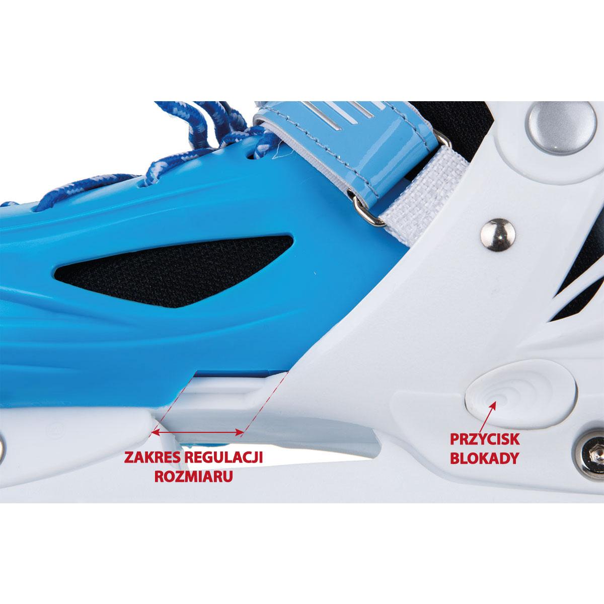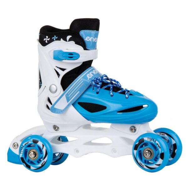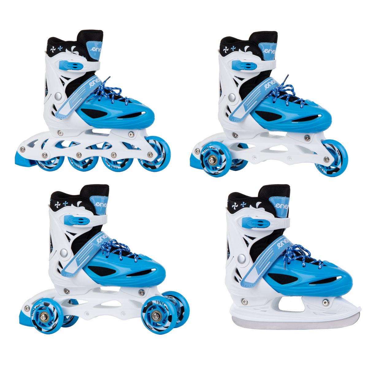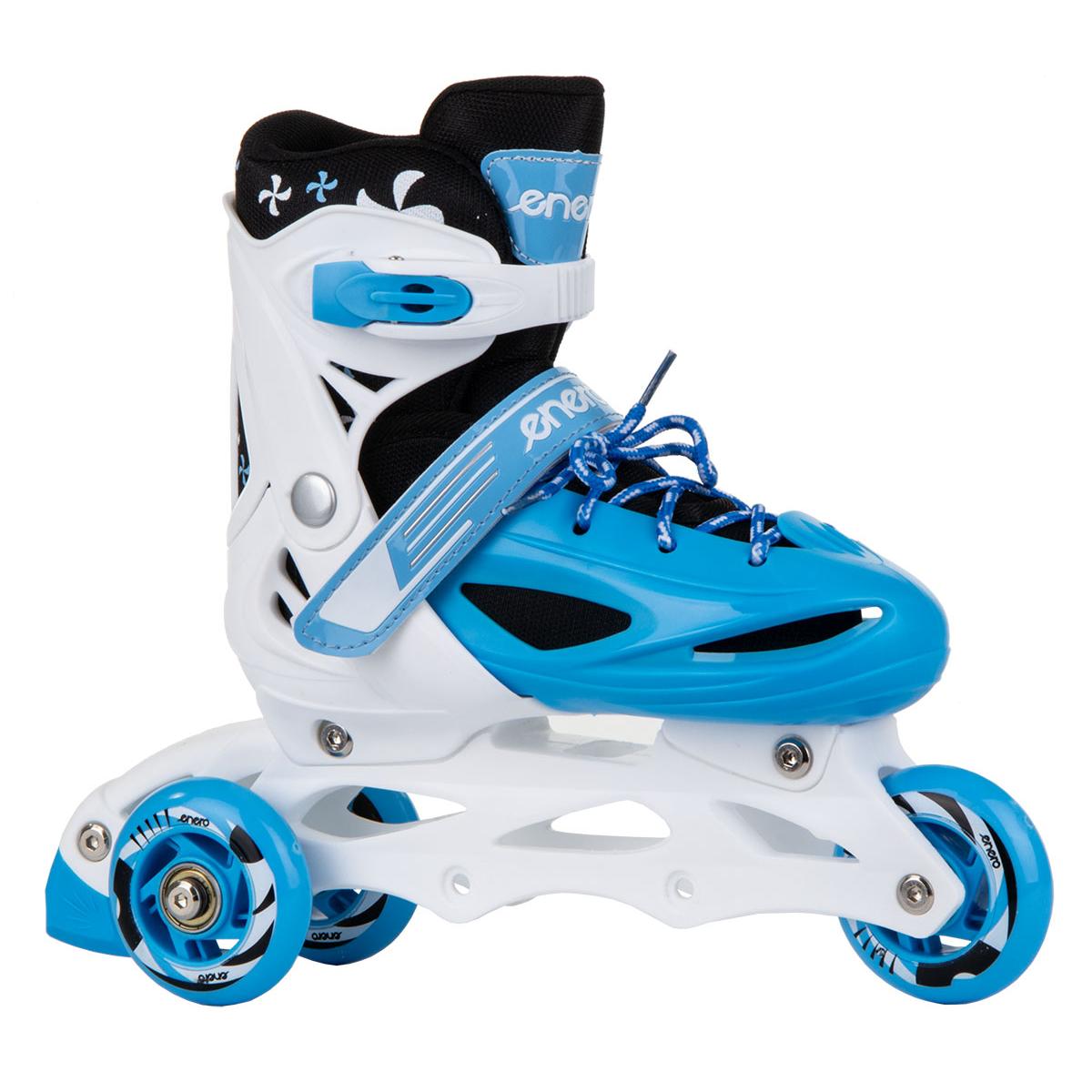 ŁYŻWOROLKI – 3 SKATE – ŁYŻWY- WROTKI 4W1 ENERO gwarantują czystą przyjemność z jazdy. Wyposażone są w lekką i mocną płozę z materiału PP, hamulec przy jednej rolce, kółka PVC o średnicy 64 mm i szerokości 22 mm, regulowane 3 zapięcia oraz regulację rozmiaru. Kółka z tworzywa PVC oraz łożyska ABEC 5 pozwalają na mniejsze opory toczenia, dobrze adoptują się do podłoża, idealnie pasują do nauki lub spokojnej rekreacyjnej jazdy. Wzmocniony wierzch obuwia , szeroki wygodny krój oraz miękka wyściółka wokół kostki zwiększają znacznie komfort użytkowania podczas jazdy. Ostrze łyżwy wykonane ze stali nierdzewnej jest odporne na uszkodzenia oraz rdzę.