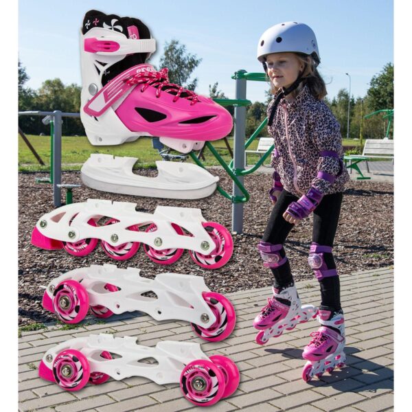 Funkcja 4 w 1 pozwala oszczędzić czas i pieniądze. Dzięki niej kupujesz rolki, łyżwy, wrotki oraz 3 SKATE za jednym razem, a dzięki regulacji rozmiaru może z nich dodatkowo korzystać np.: rodzeństwo. Do bezpiecznej jazdy niezbędne będą akcesoria typu kask, ochraniacze dostępne na naszej stronie internetowej!