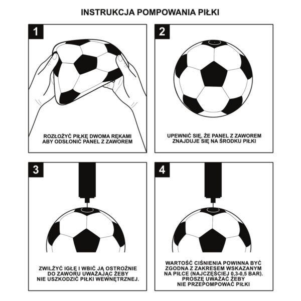Uwaga: piłkę należy pompować zgodnie z zalecanym dla niej ciśnieniem po wczesniejszym rozłożeniu i tylko zwilżoną wcześniej igłą! Pompowanie suchą igłą może trwale uszkodzić wentyl.