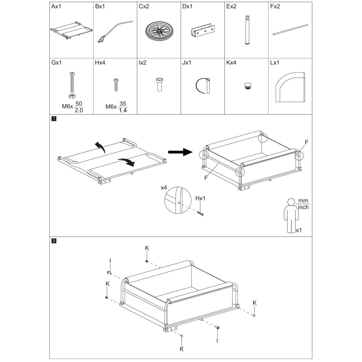 - Wymiar przyczepki (powierzchnia ładunkowa) ok.: 70 x 56 x 30 cm (dł. x szer. x wys.)