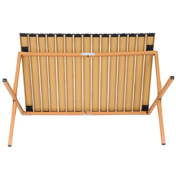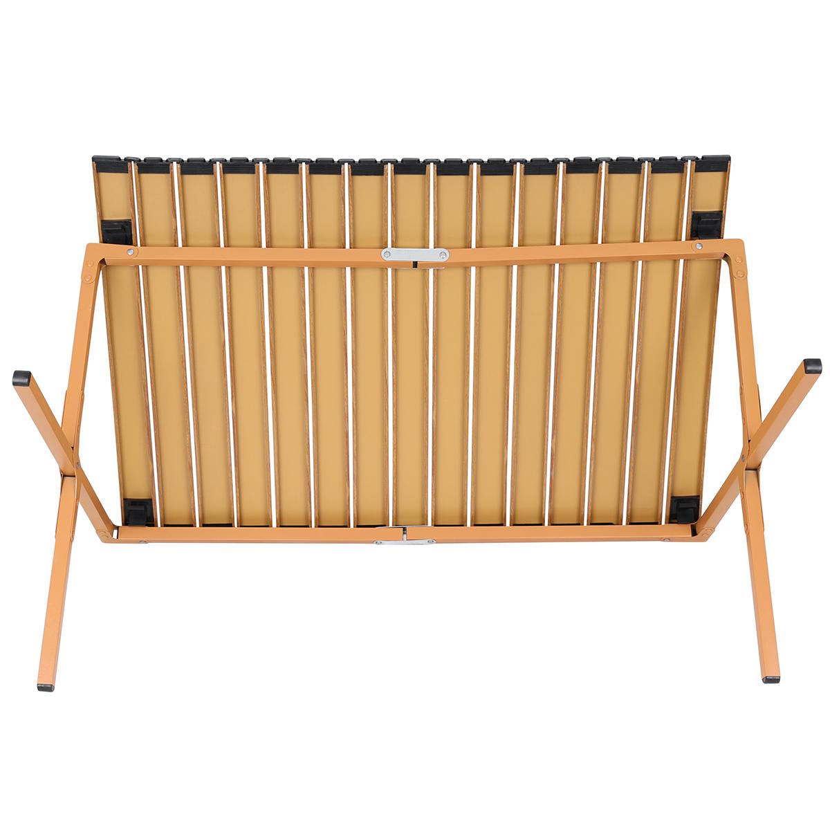 Blat stołu to listwy stalowe, łatwe w konserwacji i czyszczeniu, imitujące drewniane deski, dzięki czemu wyróżnia się wyglądem wśród innych turystycznych stolików.