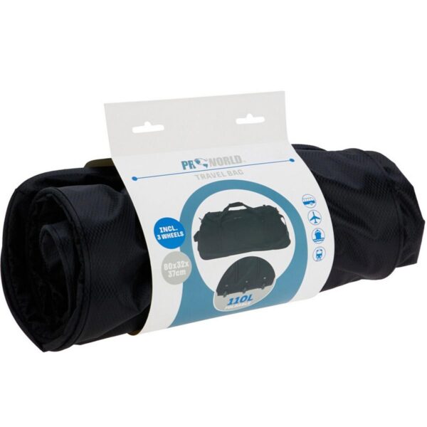 TORBA PODRÓŻNA 110L CZARNA, POLIESTER RIBSTOP, CZARNY ZAMKNIĘTY NA ZAMEK, ELASTYCZNY SZNUREK Z OKRĄGŁYM SZNUREKIEM NA GÓRZE, 2 SIATKOWE KIESZENIE BOCZNE PO 1 STRONIE, 2 CZARNE UCHWYTY Z PARĄ NA GÓRZE I 1 Z BOKU Z PASUJĄCYM DO TKANINY WYŚCIÓŁKĄ Z RZEPEM, 1 REGULOWANY CZARNY PASEK NA RAMIĘ, WEWNĘTRZNA POWŁOKA, CZARNE SZCZEGÓŁY Z LIN/PARĄ PO BOKU, 3 KÓŁKA, LOGO PROWORLD PO BOKU, KAŻDA Z PAPIEROWĄ RĘKAWEM/ 395X185X120MM,