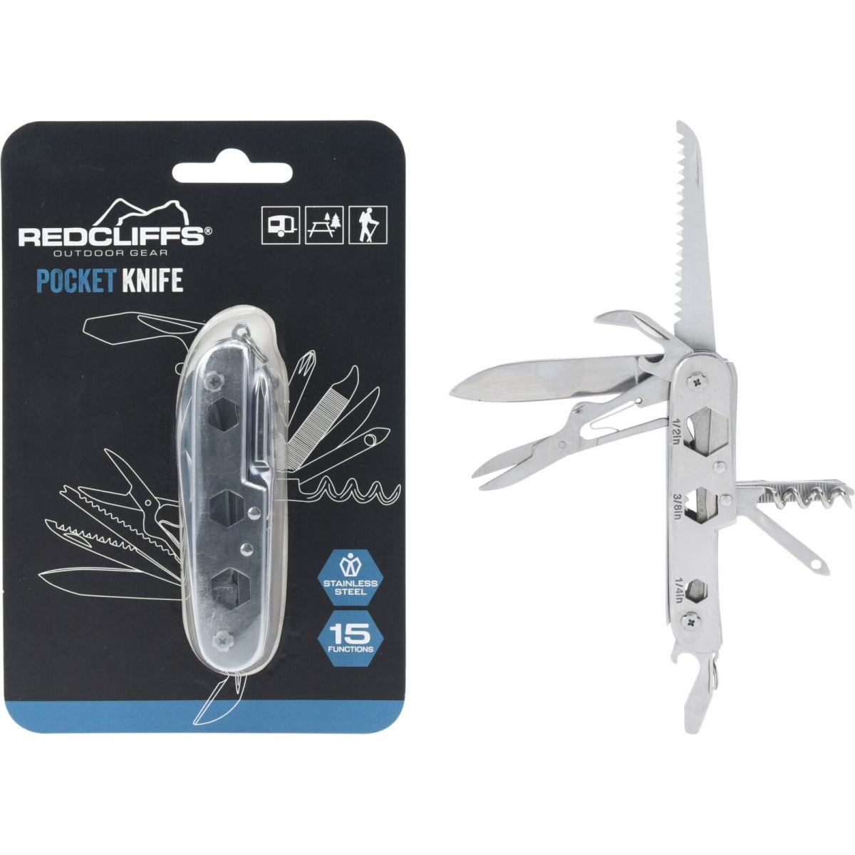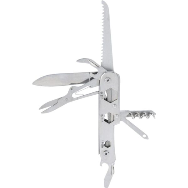 NÓŻ 15 FUNKCYJNY, STAL NIERDZEWNA, ROZMIAR 9CM, Z RĄCZKĄ W KOLORZE SREBRNYM.