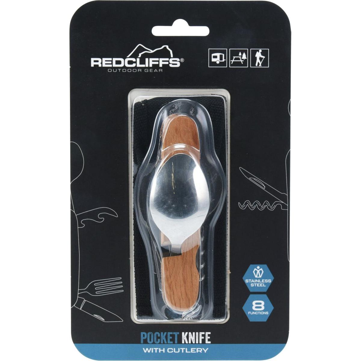 - 6w1: nóż, nożyk z ostrym końcem, łyżka, widelec, korkociąg, otwieracz do puszek, etui, kółko na klucze