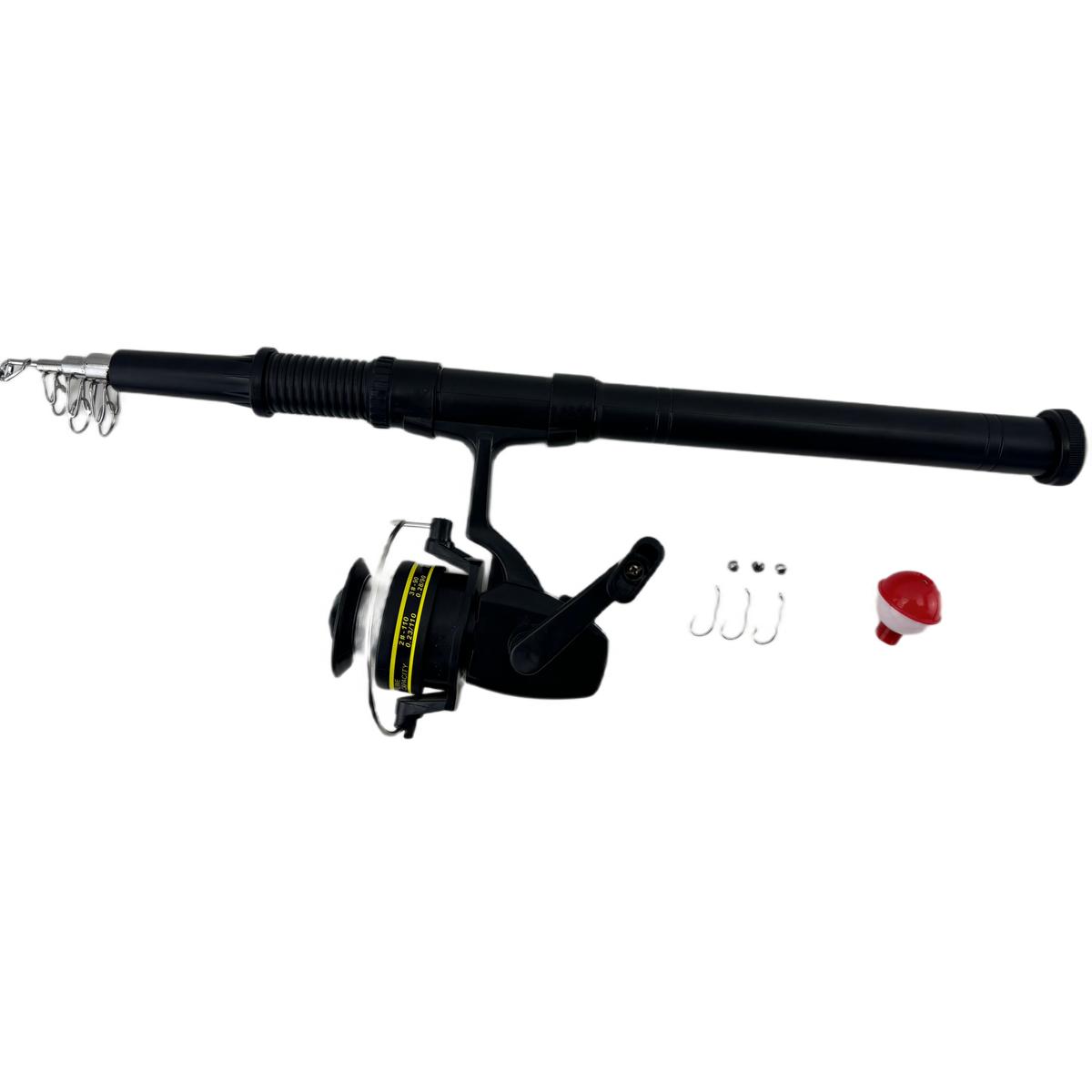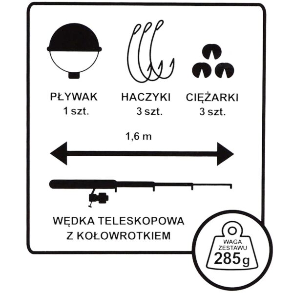 - W zestawie: wędka z wędziskiem plus kołowrotek, haczyk x 3 sztuki, spławik x1 sztuka, ciężarki x 3 sztuki
