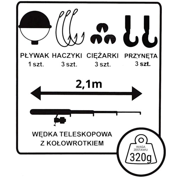 - W zestawie: wędzisko składające się z 6 segmentów (2,10cm), kołowrotek (sunshine DF1000), żyłka, haczyk x 3 sztuki, spławik, ciężarki x 3 sztuki, przynęta 3 sztuki